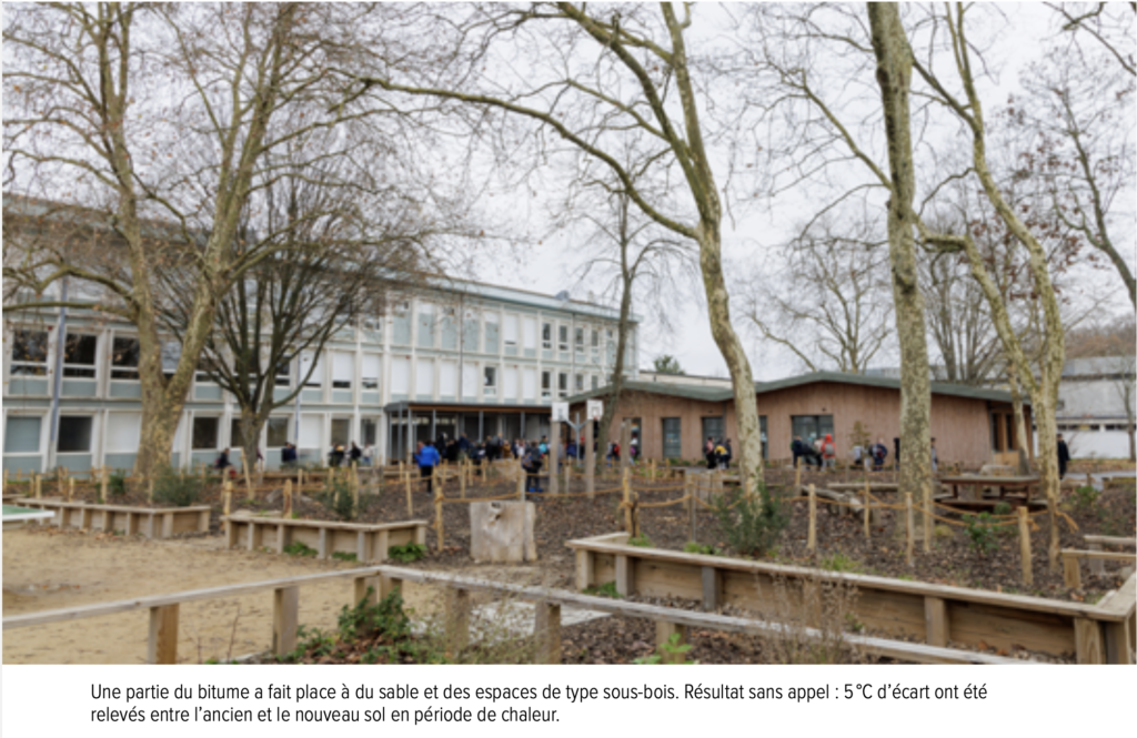 Une partie du bitume a fait place à du sable et des espaces de type sous-bois. Résultat sans appel : 5 °C d’écart ont été relevés entre l’ancien et le nouveau sol en période de chaleur. «